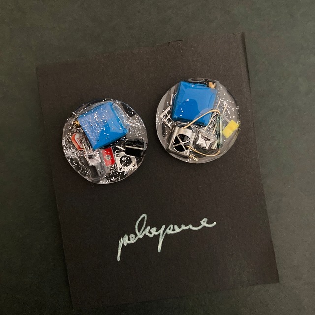 基板を分解した際に出た電子パーツたちを集めて個性的なピアスに仕上げました・:*+.\(( °ω° ))/.:+ サイズ:直径約2.5×2.5(cm) ピアスパーツ:サージカルステンレス