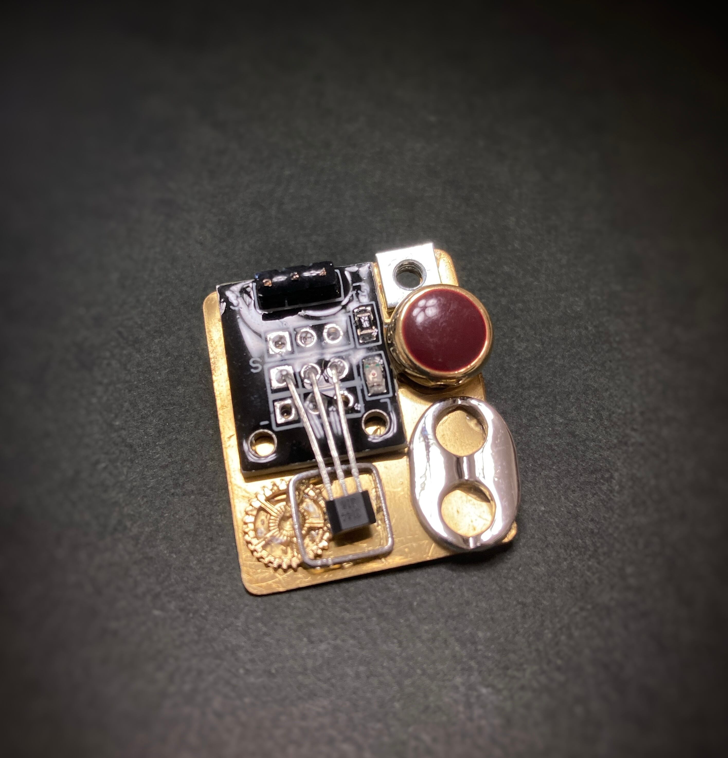 切り出した真鍮板に黒い基板パーツなどをあしらったブローチ・:*+.\(( °ω° ))/.:+